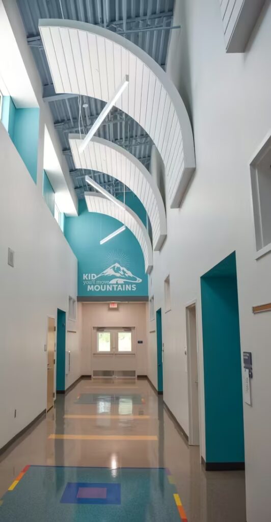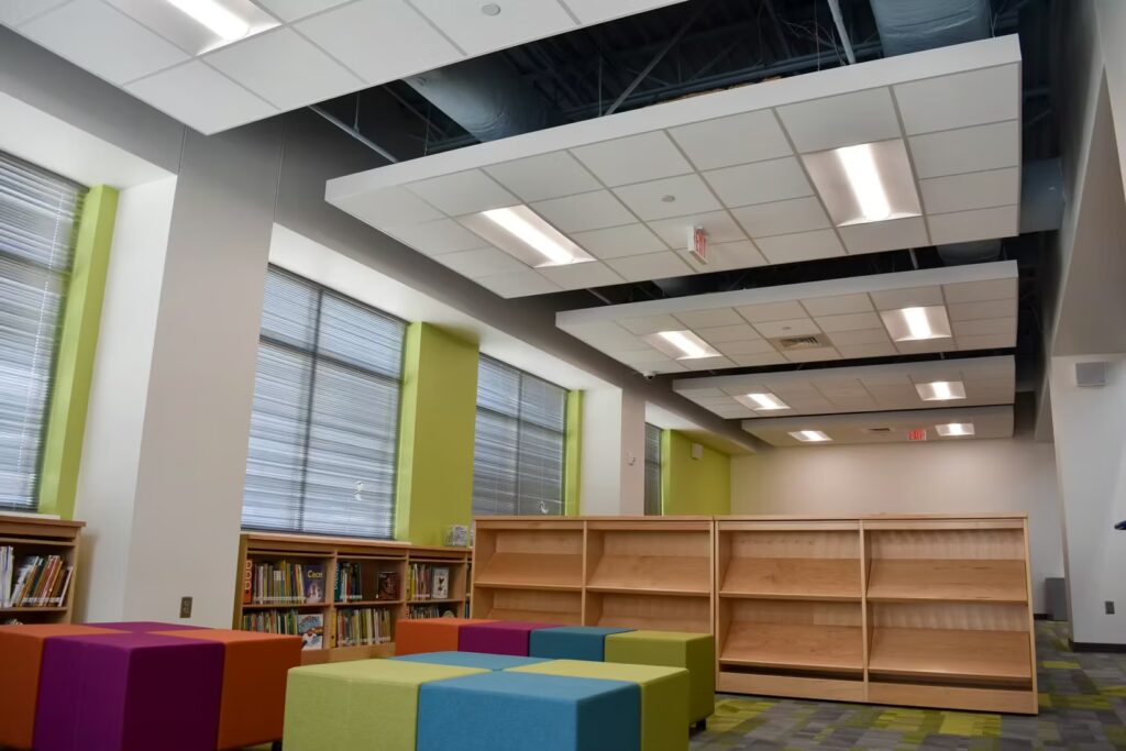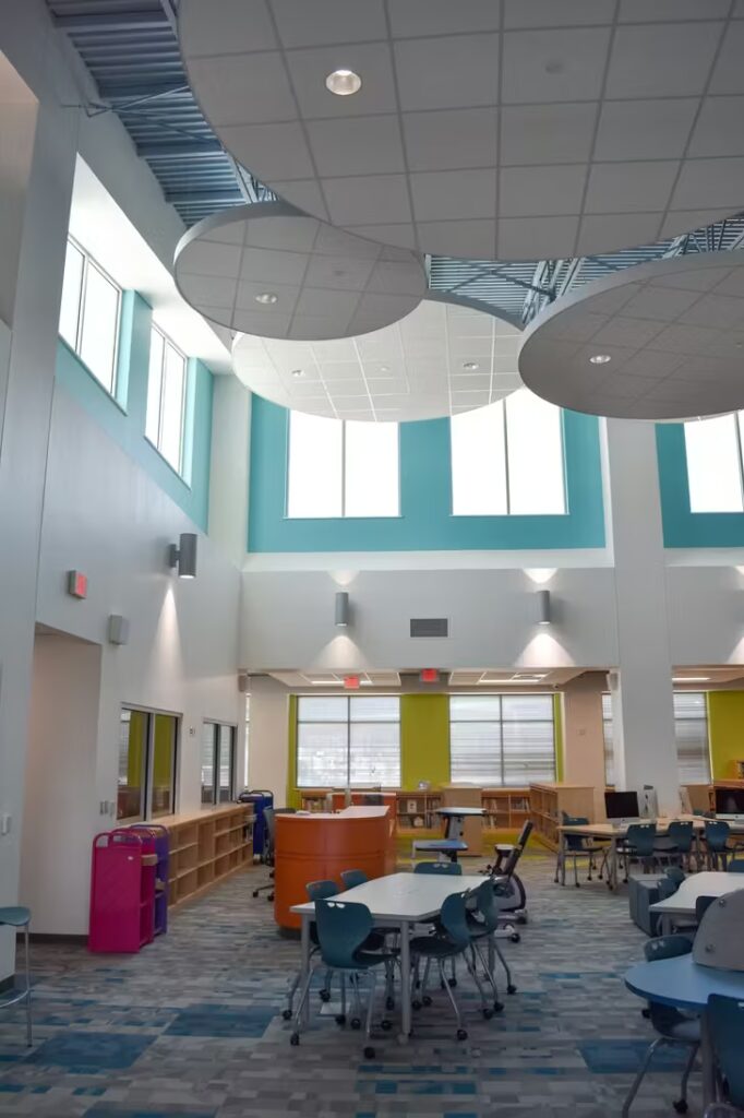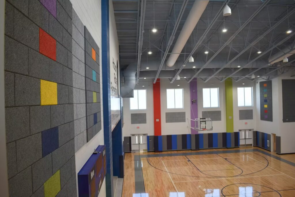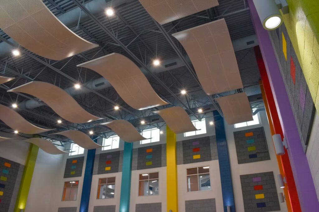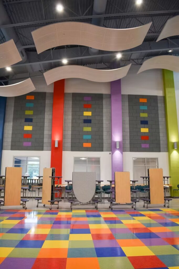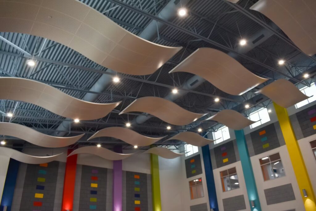 Students at this elementary school have a gorgeous learning environment to look forward to when school is in session. Our foreman led the installation team on this colorful, new construction project. Bonitz installed ceiling clouds and Tectum panels on the walls for both aesthetic and noise reduction purposes.