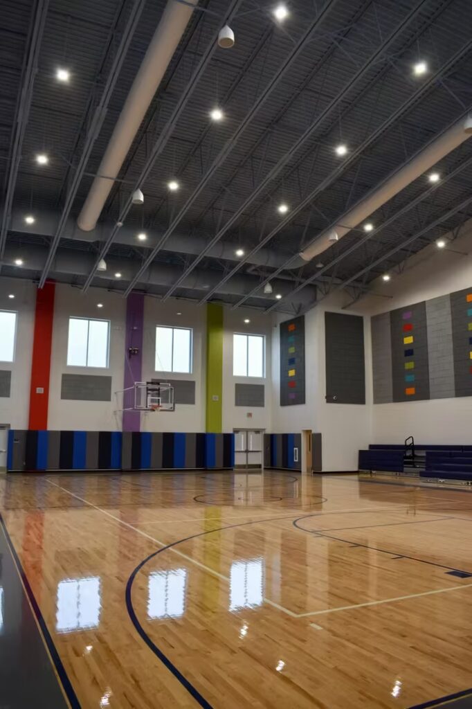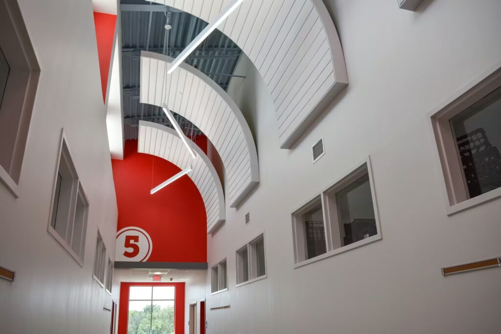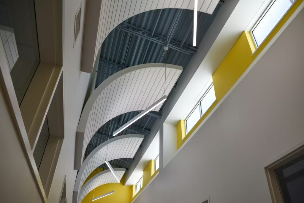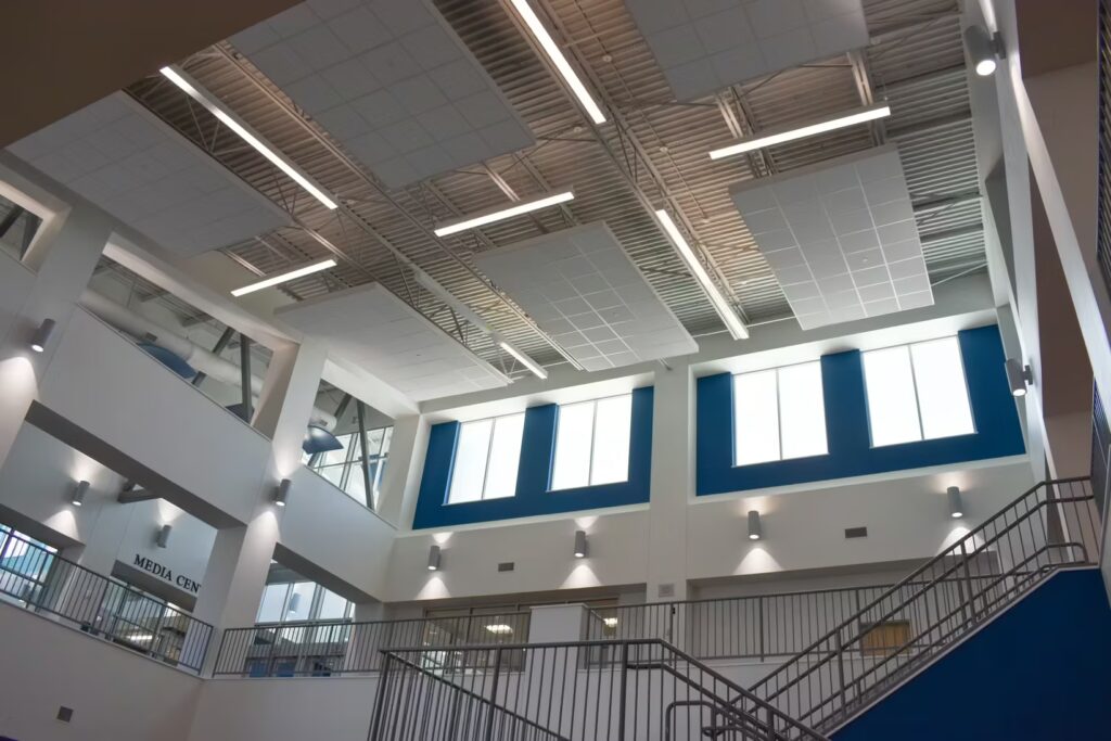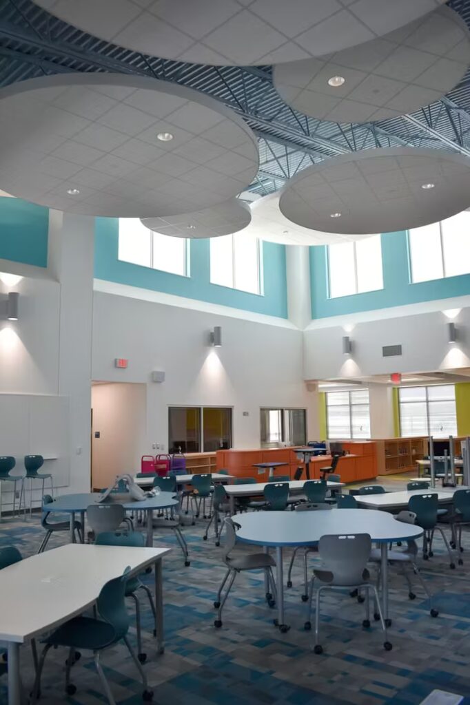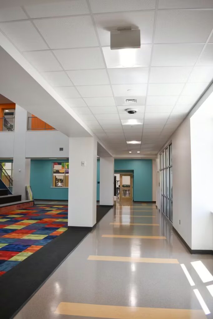 Students at this elementary school have a gorgeous learning environment to look forward to when school is in session. Our foreman led the installation team on this colorful, new construction project. Bonitz installed ceiling clouds and Tectum panels on the walls for both aesthetic and noise reduction purposes.