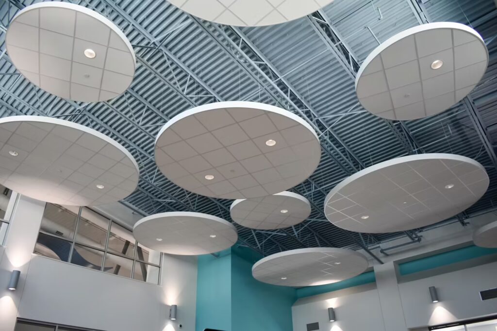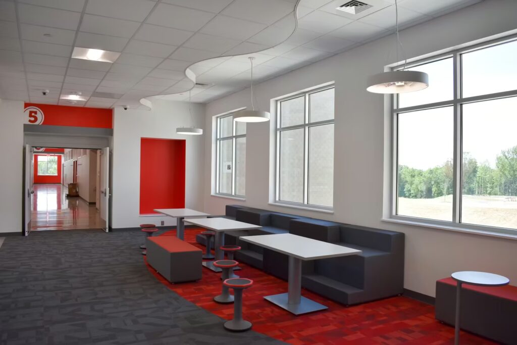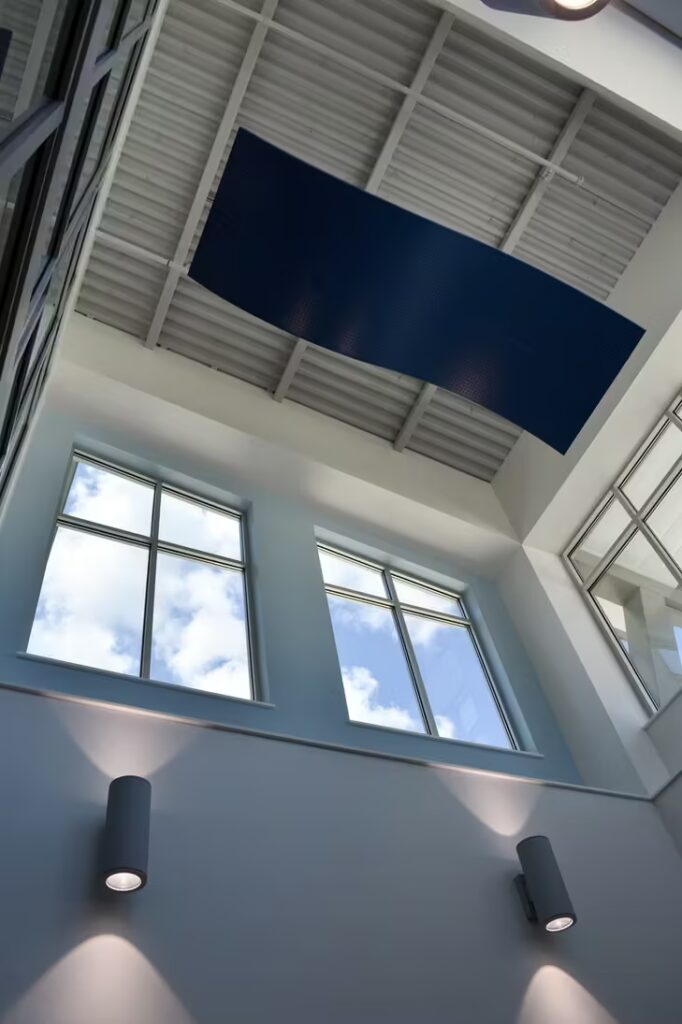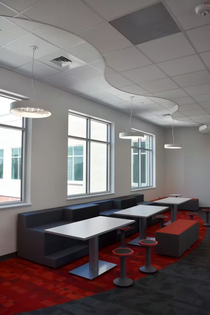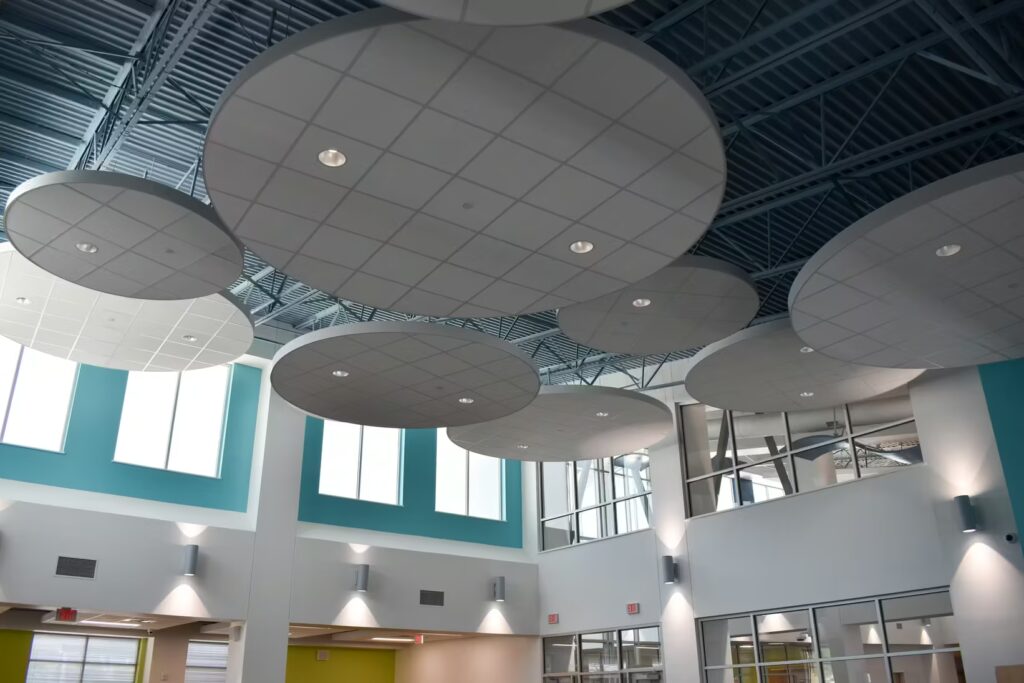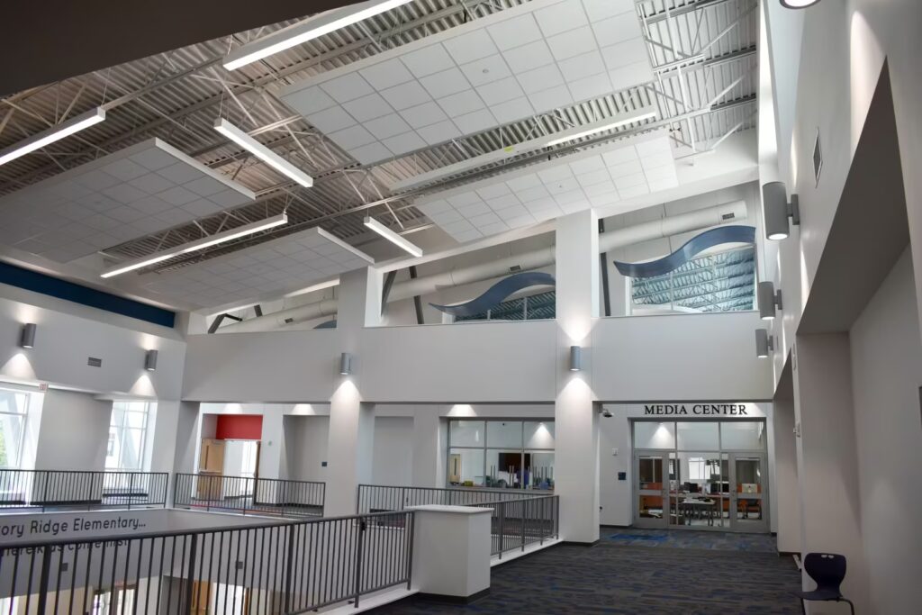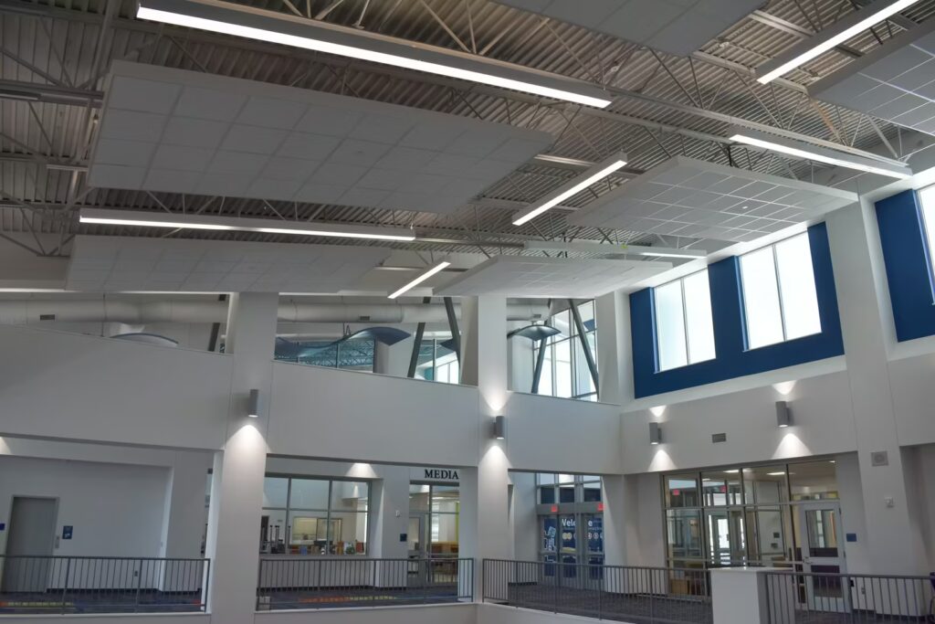 Students at this elementary school have a gorgeous learning environment to look forward to when school is in session. Our foreman led the installation team on this colorful, new construction project. Bonitz installed ceiling clouds and Tectum panels on the walls for both aesthetic and noise reduction purposes.