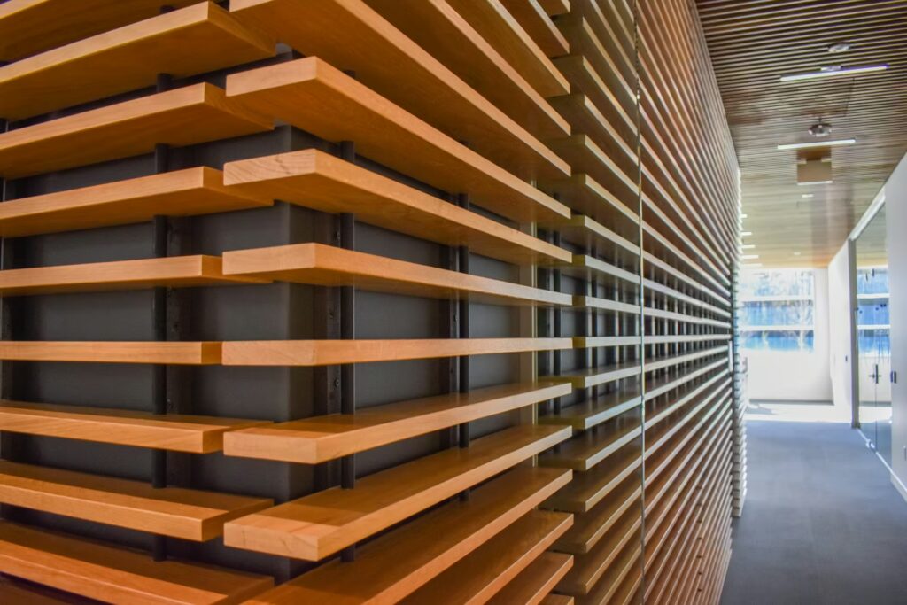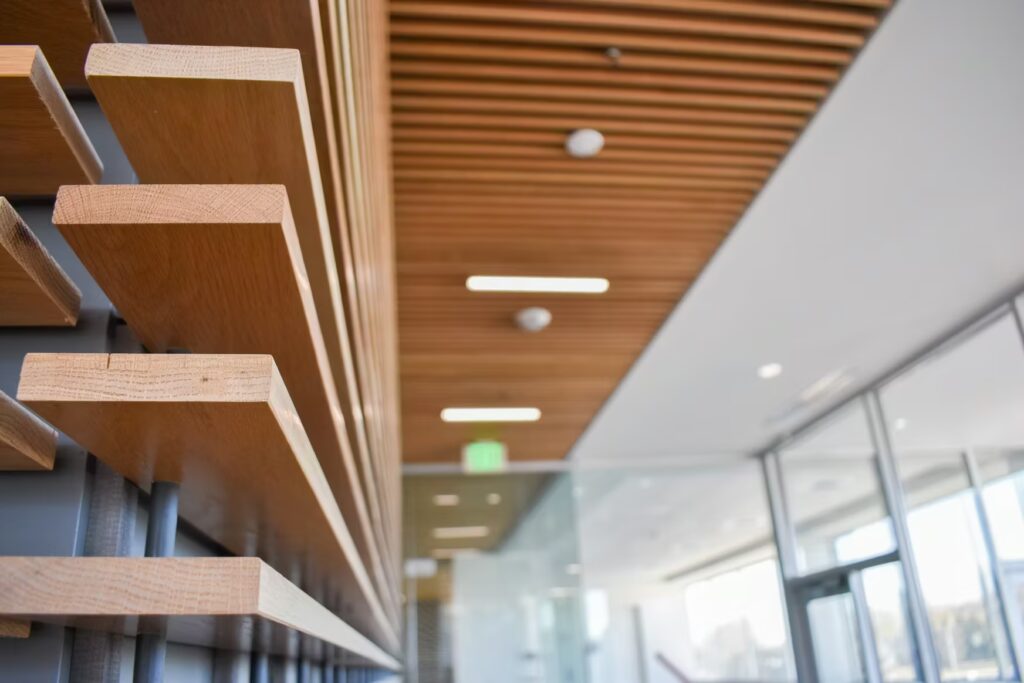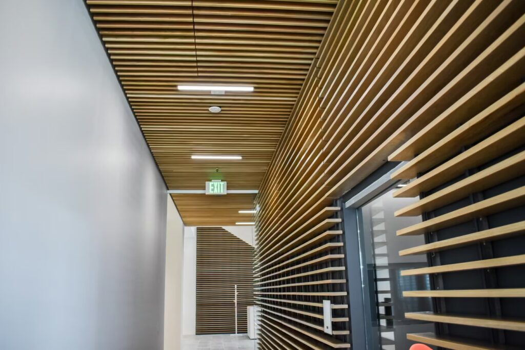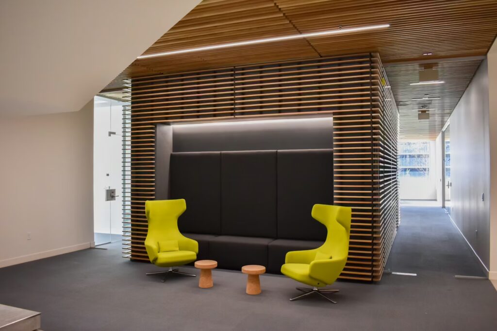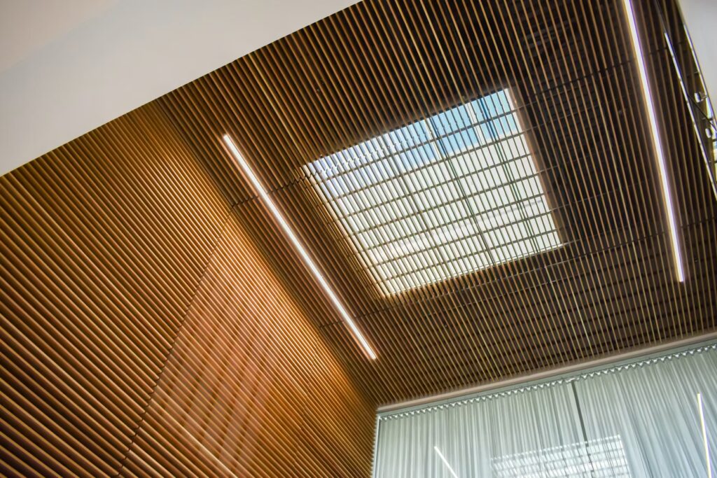 The natural light in this space truly makes the wood elements come to life. Bonitz installed the drywall, acoustical ceilings, Rulon wood ceilings and walls, and carpet at this Dallas, NC-based corporate building.