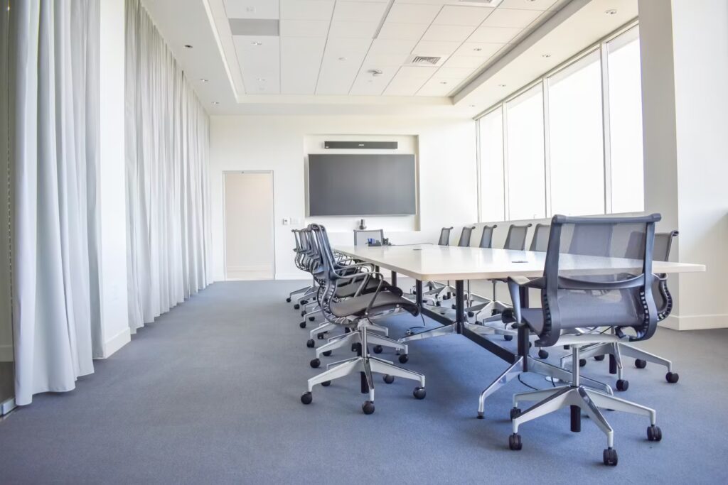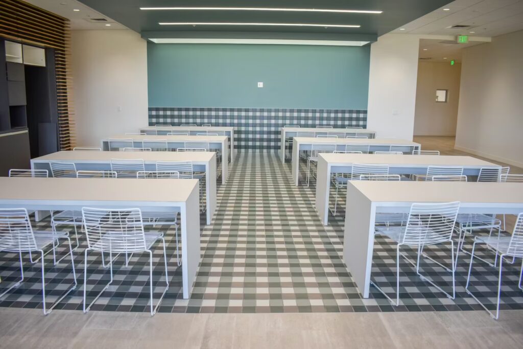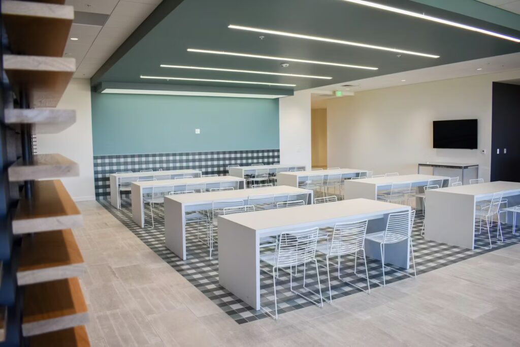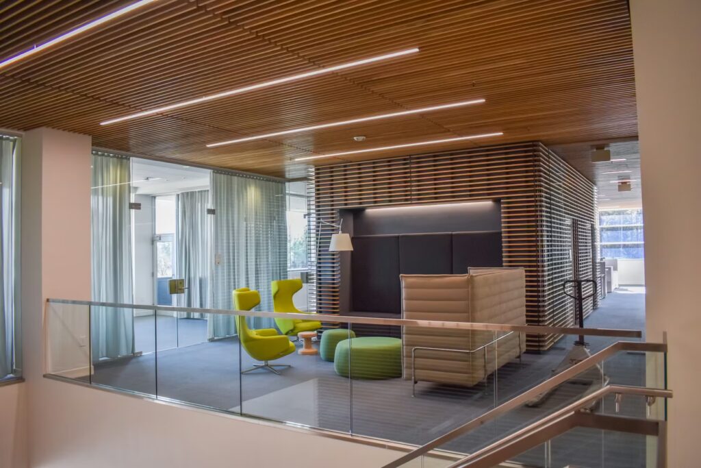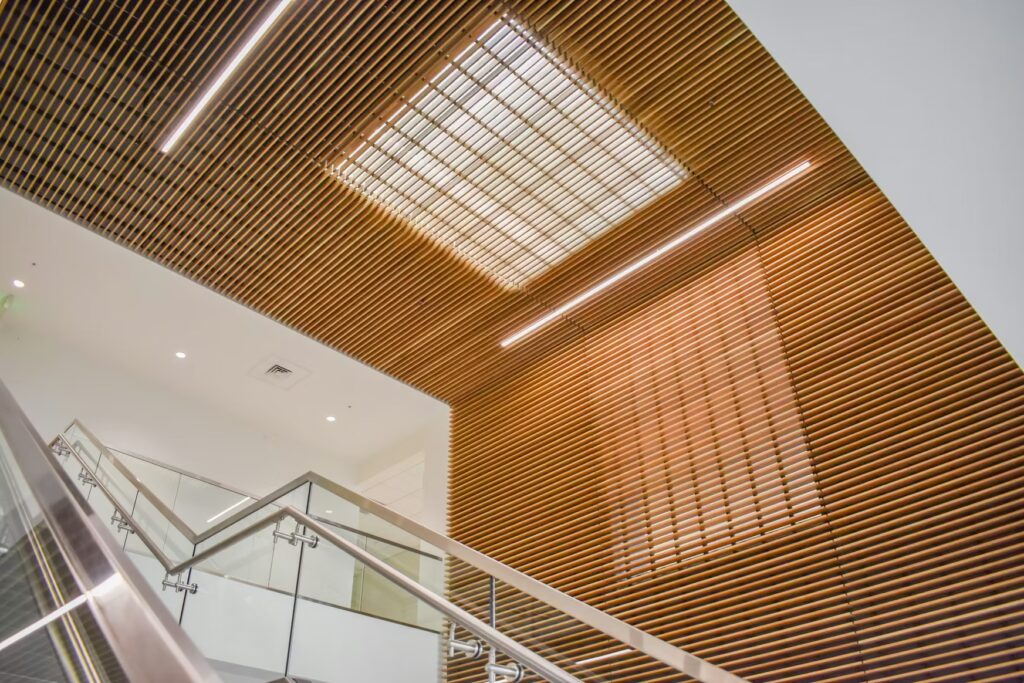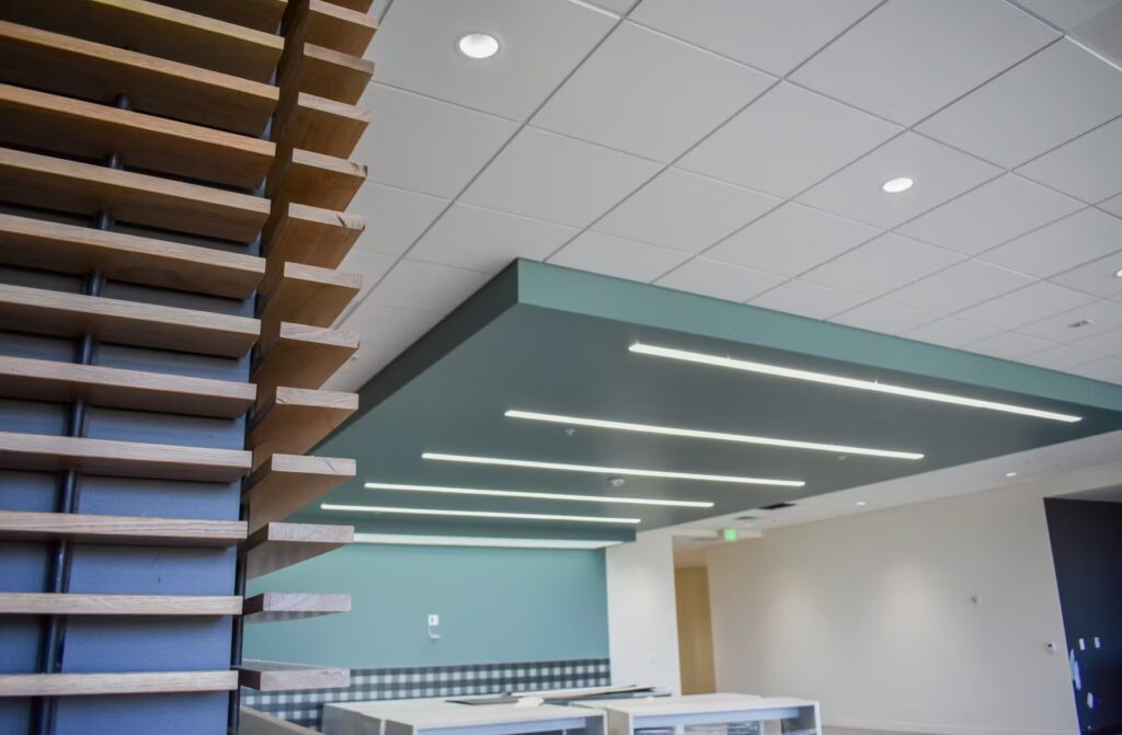 The natural light in this space truly makes the wood elements come to life. Bonitz installed the drywall, acoustical ceilings, Rulon wood ceilings and walls, and carpet at this Dallas, NC-based corporate building.